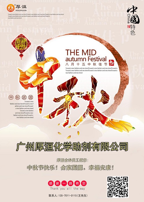 放假期間只接單,節(jié)后發(fā)貨。如有緊急業(yè)務請直接聯(lián)系公司負責人王先生:135-7011-0115。廣州厚洹分散劑廠家全體員工提前祝您:中秋快樂!合家團員!幸福安康