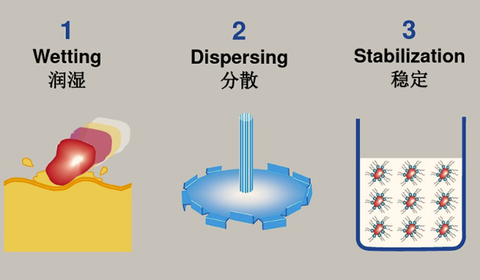 1、潤(rùn)濕:樹脂或添加劑取代顏料表面的吸附物,如空氣、水份,使顏料表面由固/氣相轉(zhuǎn)化為固/液相。