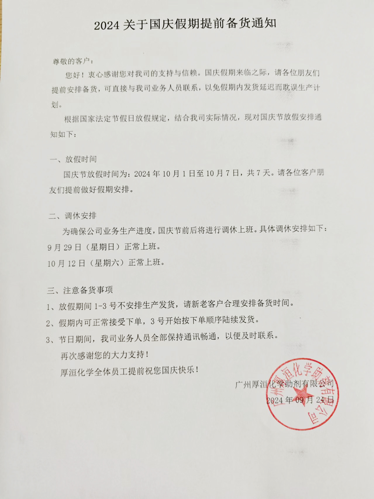2024 年度國慶節(jié)放假通知